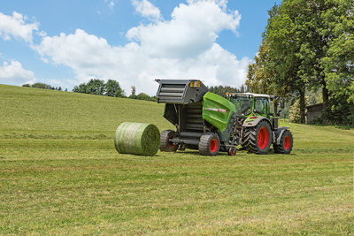 Si le fourrage doit être pressé, la presse à balles rondes Fendt Rotana est utilisée. Elle convainc par sa densité de pressage élevée, sa coupe précise et son enfermement sûr ; on obtient ainsi des balles rondes de qualité supérieure.
