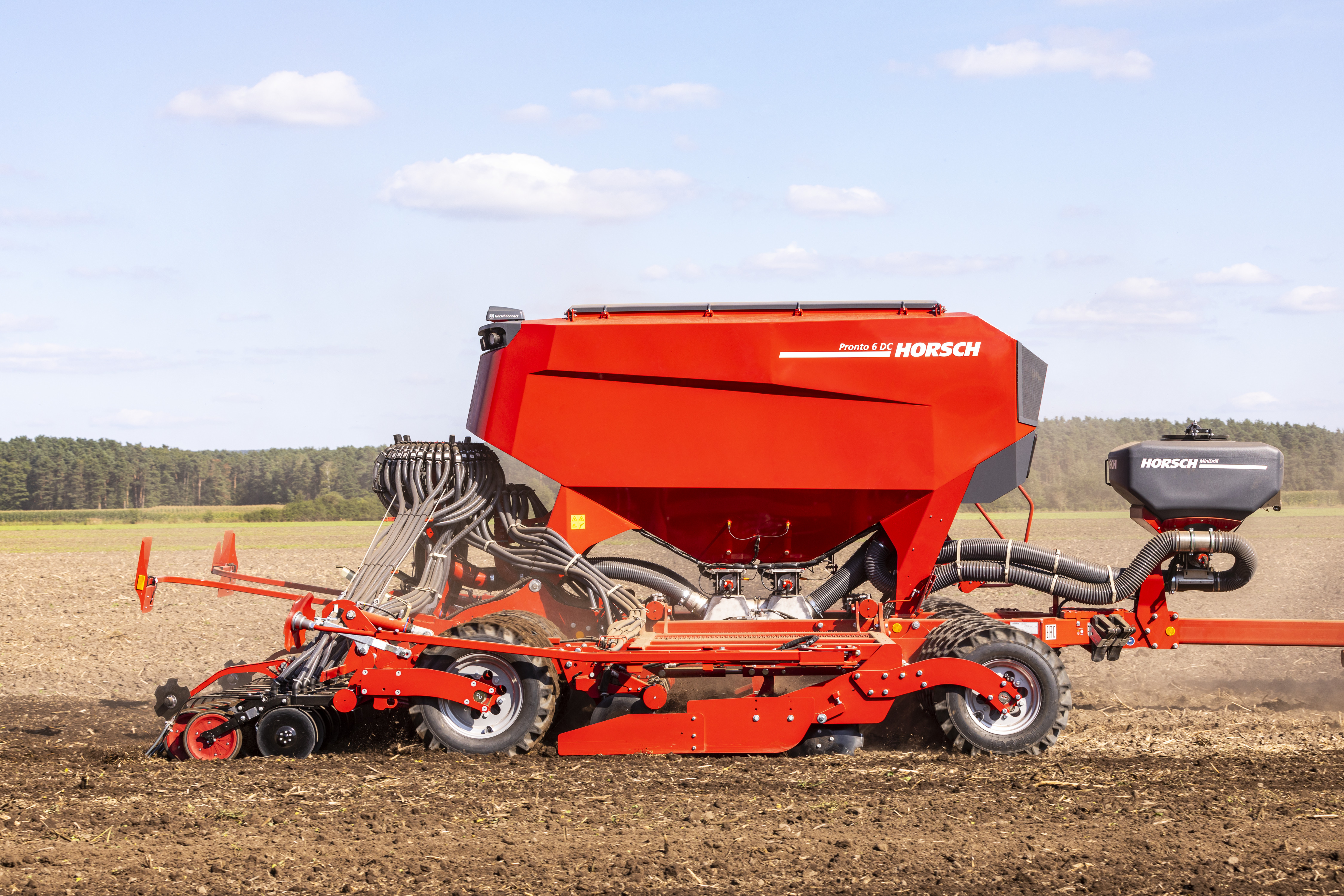 Le MiniDrill HORSCH fait office de troisième cuve pour doubler la capacité lors du semis de colza avec fertilisation combinée. Il existe deux variantes de cette troisième cuve : le MiniDrill G& F, qui sert de troisième cuve pour les semences et le MiniDrill PPF, qui est utilisé pour transporter des micro-granulés ou un anti-limaces. Ce dernier dispose de sa propre soufflerie, d'un système pneumatique avec une tête de distribution séparée et des éclateurs disposés devant un élément semeur sur deux. La combinaison des disques de fertilisation PPF, des éléments semeurs TurboDisc et des éclateurs du MiniDrilll PPF permettent de placer séparément trois produits sur trois horizons de semis.